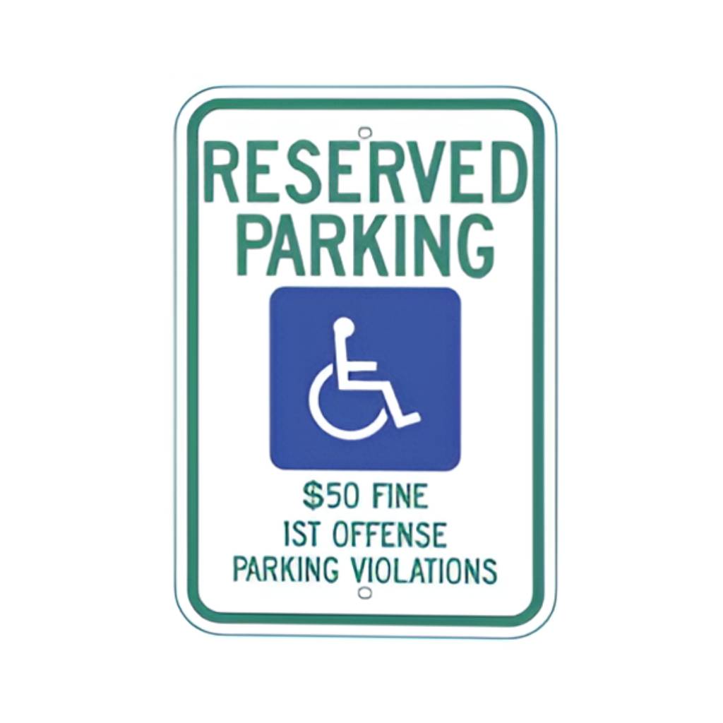 | R7-8AL (Alabama handicap) RESERVED PARKING $50 FINE 1ST OFFENSE PARKING VIOLATIONS. (Standard Reflective on .080 gauge aluminum). |
