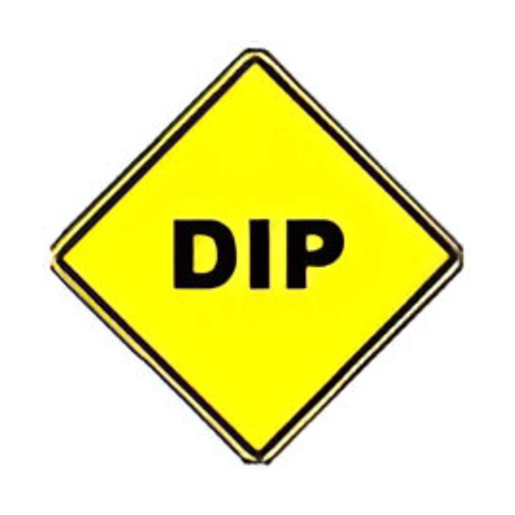 W8-2 DIP. (Standard Reflective on .080 gauge aluminum). Should be posted to warn of a sharp depression in the road. May use an advisory speed plate (W13-1) below the sign.