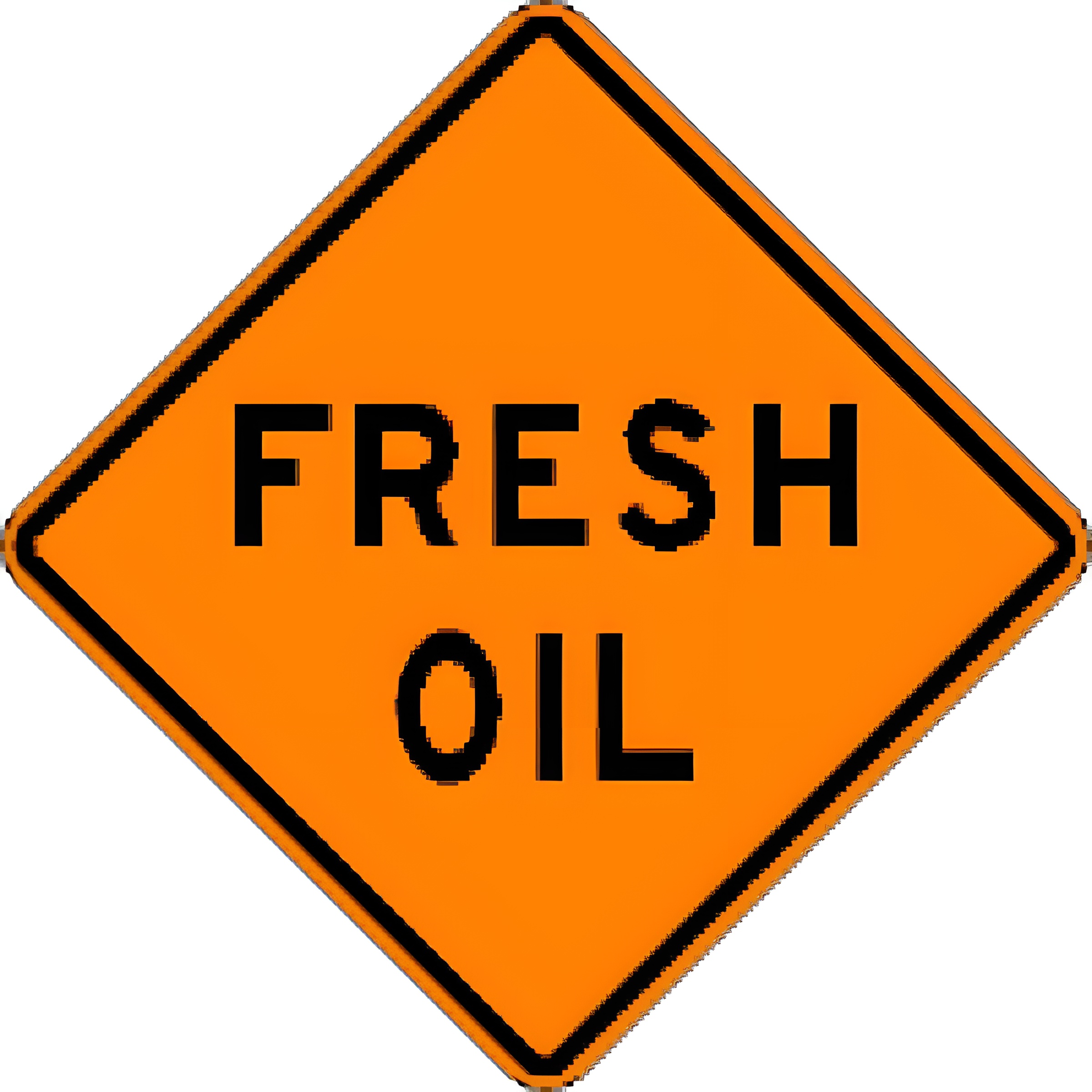 36-inch W21-2 FRESH OIL (or TAR). (Standard Reflective on .080 gauge aluminum). Should be used to warn motorists of the surface treatment.