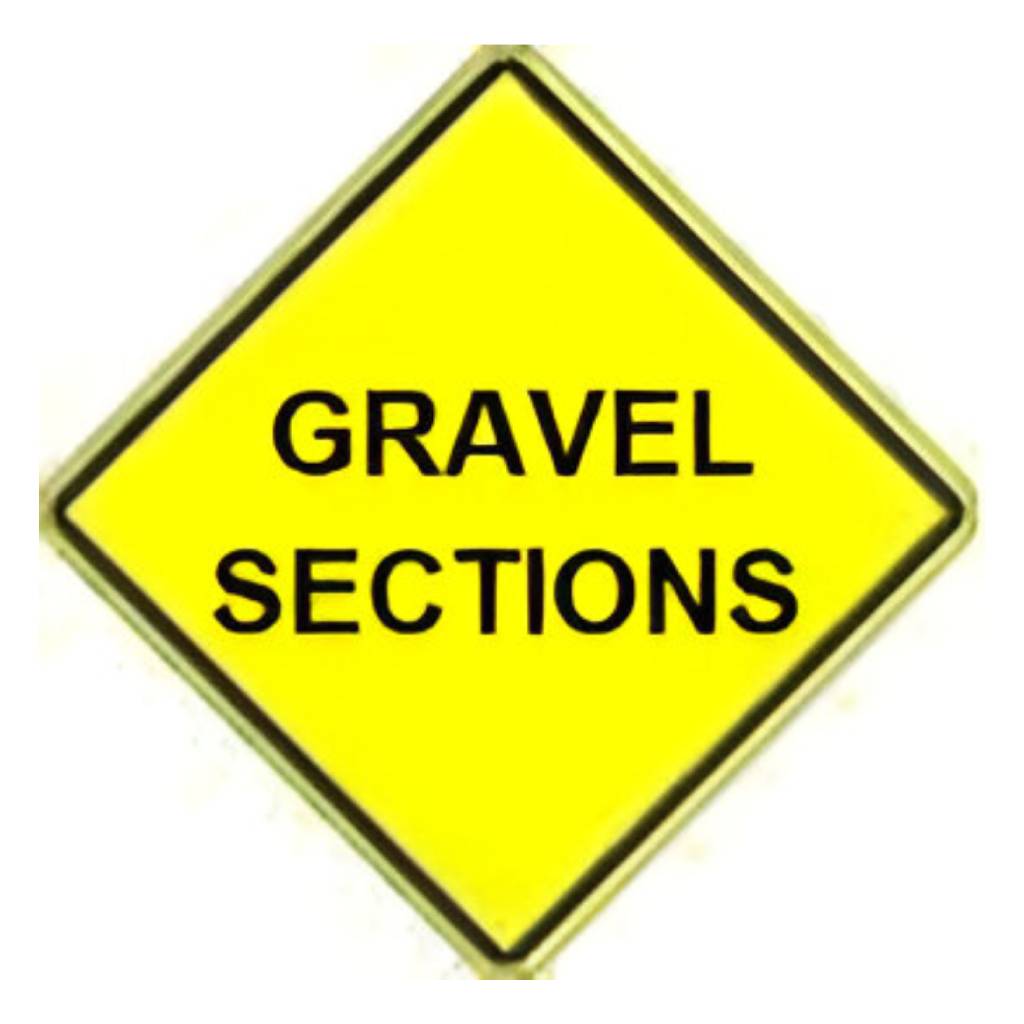 Gravel Sections warning sign. (Standard Reflective on .080 aluminum). Used on one-lane road that’s partly paved with sections of gravel. The purpose of this sign is to use it in one place even though road may contain many sections of gravel – to reduce overall signage. Road must have three or more sections of gravel, and sign should be posted only once every 5 miles.