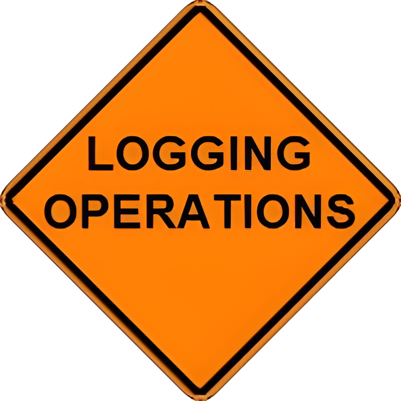 Logging Operations warning sign. (Standard Reflective on .080 aluminum). Used to warn motorists of hazards associated with logging or log hauling on or along a road, or log trucks entering intersections. Cover or remove signs when the message is not appropriate. Supplemental plates, such as NEXT XX MILES (W16-4P), should be used where appropriate.