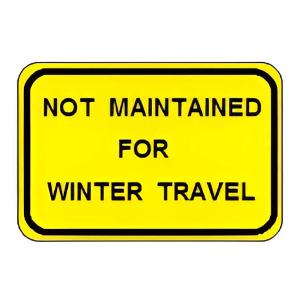 Not Maintained for Winter Travel warning sign. (Standard Reflective on .080 aluminum). Sign is used where motorists may be unaware that winter conditions make a road impassable and may wrongly assume it is maintained for winter travel.