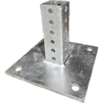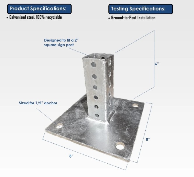 This surface mount base provides a strong, reliable solution for mounting sign posts to existing concrete surfaces. Designed for 1-3/4" sign posts, with an optional 2" post configuration, it features an 8" x 8" galvanized steel base plate and a 6" vertical stub for secure attachment. Built to resist rust and corrosion, the base includes a center drainage hole to prevent water buildup and is installed using concrete wedge anchor bolts, with the post secured by a single corner bolt.
