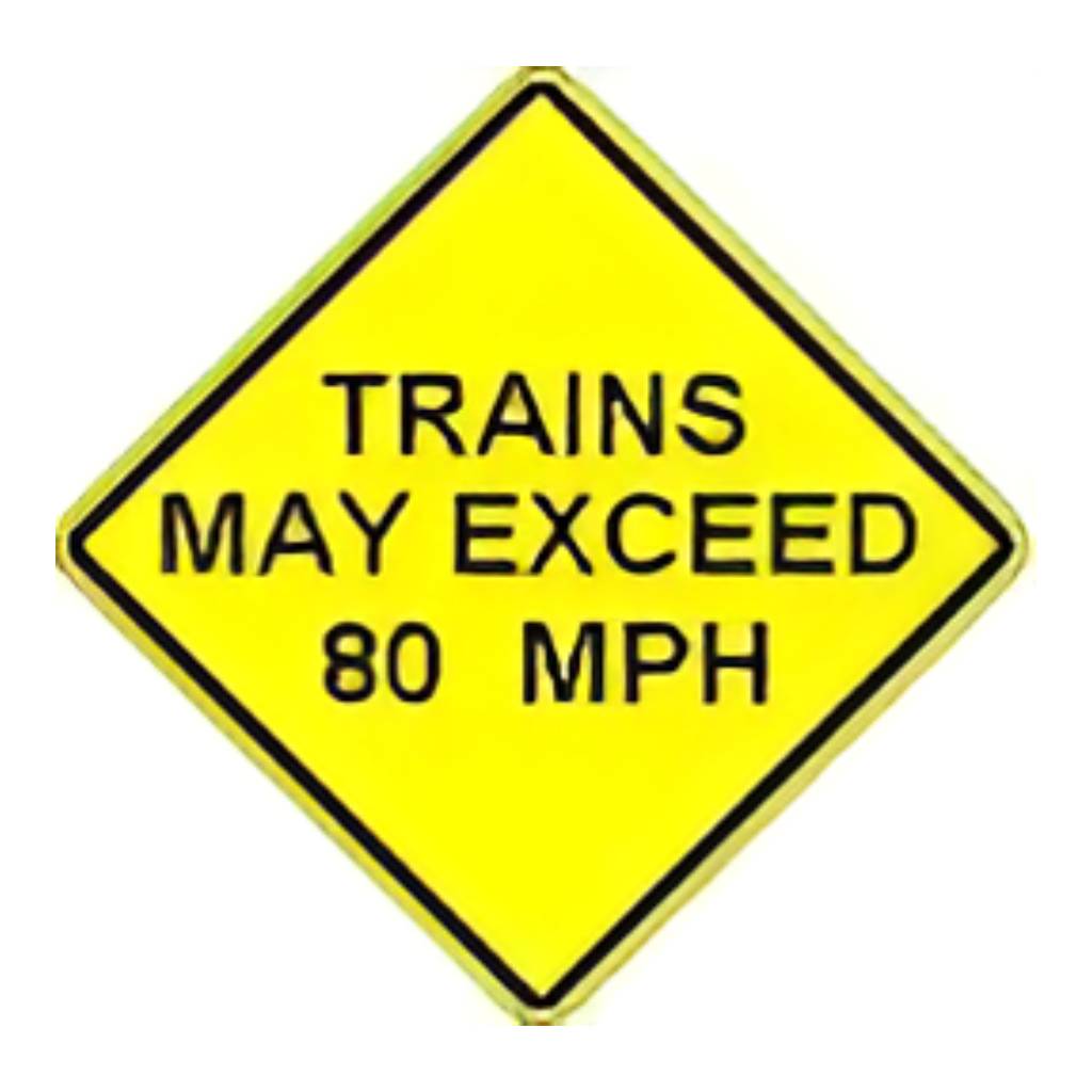 W10-8 TRAINS MAY EXCEED 80 MPH. (Standard Reflective on .080 gauge aluminum). Should be installed at railroad crossings where train speeds may exceed 80 MPH.