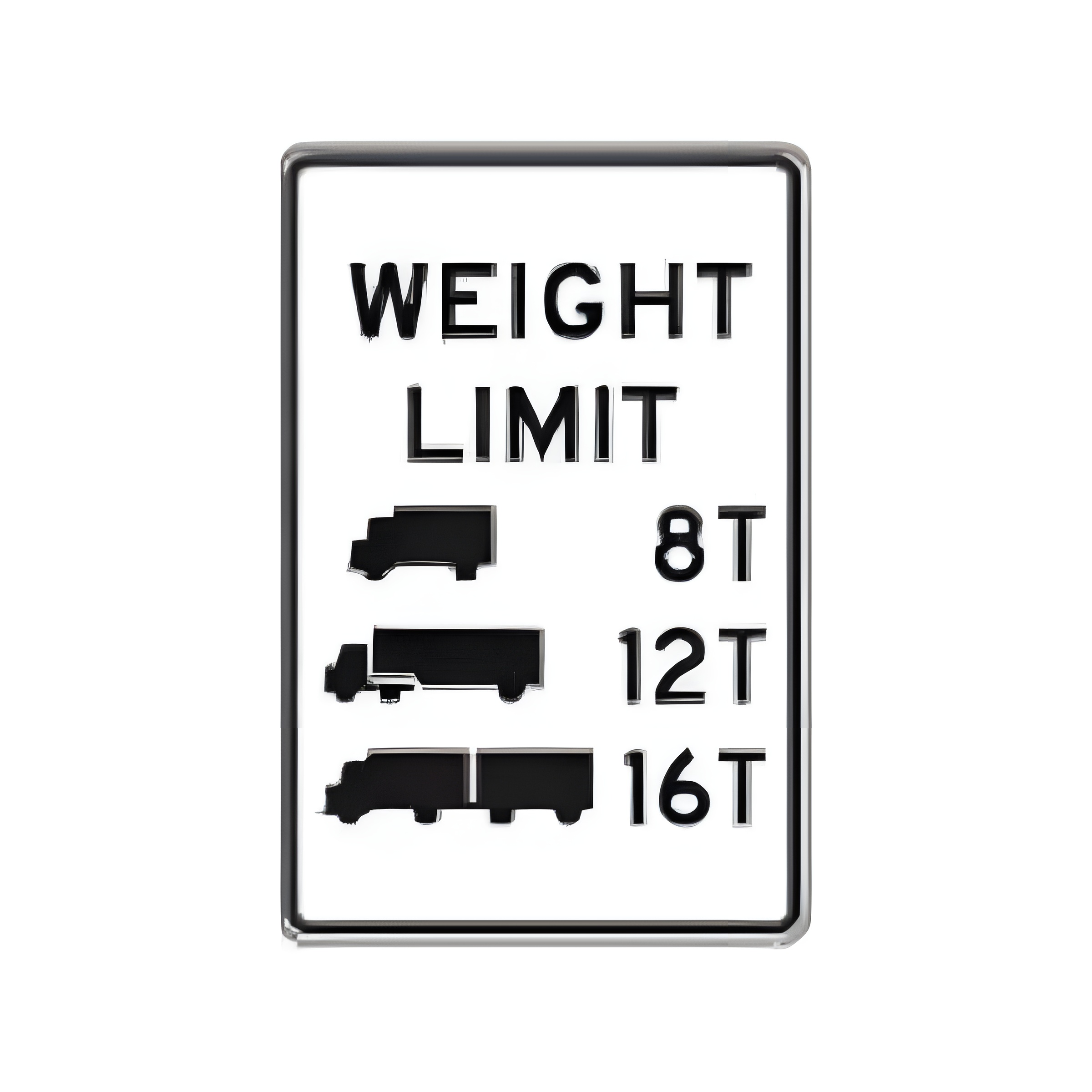 12×24-inch WEIGHT LIMIT (2 __T, 3 __T and 4 __T axle). (Standard Reflective on .080 gauge aluminum). Should be posted at intersections approaching the load-limit zone or other points where over-weight vehicles can detour or turn around.