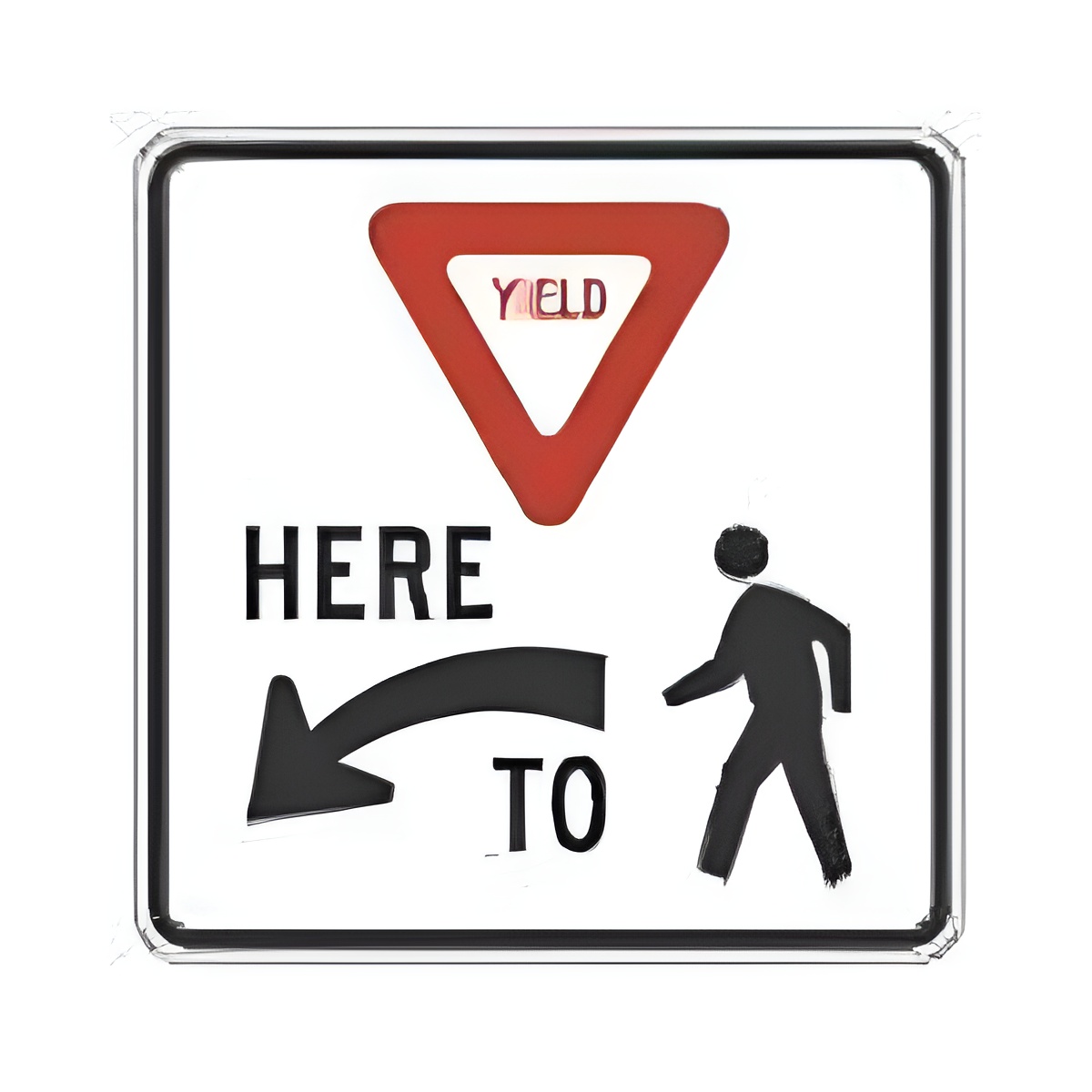 R1-5 (Yield symbol) HERE (Arrow Southwest) TO (Pedestrian symbol). (Standard Reflective on .080 gauge aluminum). Used at pedestrian crossings without traffic lights. Sign should be placed 20 to 50 feet ahead of marked crosswalk.